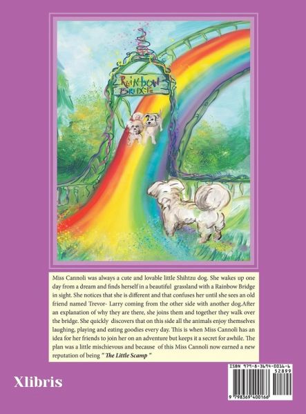 Miss Cannoli was always a cute and loveable Shihtzu dog, She wakes up one day from a dream and finds herself in a beautiful grassland with a Rainbow Bridge in sight. She notices that she is different and that confuses her until she sees an old friend named Trevor- Larry coming from the other side with another dog. After an explanation of why they are there, she joins them and together they walk over the bridge. She quickly discovers that on this side all the animals enjoy themselves, laughing, playing and eating goodies every day. This is when Miss Cannoli has an idea for her friends to join her on an adventure but keeps it a secret for awhile. The plan was a little mischievous and because of this Miss Cannoli now earned a new reputation of being "The Little Scamp"