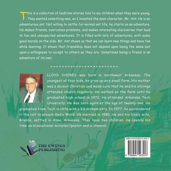 This is a collection of bedtime stories told to my children when they were young. They wanted something new, so I invented the main character, Mr. Ant. He is an adventurous ant. Not willing to settle for normal ant life, he starts on an adventure. He makes friends, overcomes problems, and makes interesting discoveries that lead to fun and unexpected adventures. It is filled with lots of adventures, with some good morals on the side. Mr. Ant shows us that we can learn new things and have fun while learning. It shows that friendship does not depend upon being the same but upon a willingness to accept to others as they are. Sometimes being a friend is an adventure of its own.
