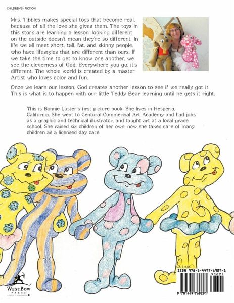Mrs. Tibbles makes special toys that become real, because of all the love she gives them. The toys in this story are learning a lesson: looking different on the outside doesn't mean they're so different. In life we all meet short, tall, fat, and skinny people, who have lifestyles that are different than ours. If we take the time to get to know one another, we see the cleverness of God. Everywhere you go, it's different. The whole world is created by a master Artist who loves color and fun. Once we learn our lesson, God creates another lesson to see if we really got it. This is what is to happen with our little Teddy Bear learning until he gets it right.