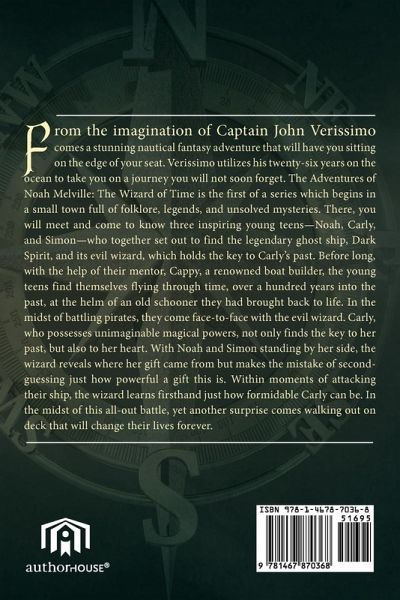 From the imagination of Captain John Verissimo comes a stunning nautical fantasy adventure that will have you sitting on the edge of your seat. Verissimo utilizes his twenty-six years on the ocean to take you on a journey you will not soon forget. The Adventures of Noah Melville: The Wizard of Time is the first of a series which begins in a small town full of folklore, legends, and unsolved mysteries. There, you will meet and come to know three inspiring young teens-Noah, Carly, and Simon-who together set out to find the legendary ghost ship, Dark Spirit, and its evil wizard, which holds the key to Carly's past. Before long, with the help of their mentor, Cappy, a renowned boat builder, the young teens find themselves flying through time, over a hundred years into the past, at the helm of an old schooner they had brought back to life. In the midst of battling pirates, they come face-to-face with the evil wizard. Carly, who possesses unimaginable magical powers, not only finds the key to her past, but also to her heart. With Noah and Simon standing by her side, the wizard reveals where her gift came from but makes the mistake of second-guessing just how powerful a gift this is. Within moments of attacking their ship, the wizard learns firsthand just how formidable Carly can be. In the midst of this all-out battle, yet another surprise comes walking out on deck that will change their lives forever.