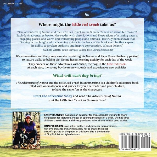 Where might the little red truck take us? "The Adventures of Nonna and the Little Red Truck in the Summertime is an absolute treasure! Each day's adventures beckon the reader with descriptions and illustrations of amazing nature, engaging places, and warm and welcoming people and animals. It's truly been shown that "talking is teaching", and the learning guides in the back of the book even further expand its ability to awaken curiosity and inspire conversation. What a delight!" --Valerie White, Youth Services, Canton Free Library, Canton, NY It's summertime and the young narrator is visiting…mehr