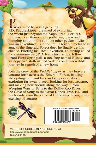 Ever since he was a geckling, P.D. Puddleskipper dreamed of exploring the world just beyond the Kapok tree. For P.D. life was more than simply gathering grubs and lounging about in the sun like other geckos. Life was an adventure! But not until a terrible metal beast attacks the Emerald Forest does he finally get his chance. Piloting his latest invention, an airship called the Puddlejumper, P.D. leads his friends, fellow lizard Flora Springtail, a tree frog named Blinky, and a sleepy tree sloth named Waffles on an incredible journey in search of a new home. Join the crew of the Puddlejumper as they bravely venture forth across the Emerald Forest, battling sticky-fingered fruit bats and slippery snakes, exploring far-away places, looking for lost treasure, and making new friends along the way. From Way-Up peak to the Rollie-Roo River, the Cave of Song to the Great Kapok Tree, P.D. and his friends learn the value of friendship through their exciting adventures.