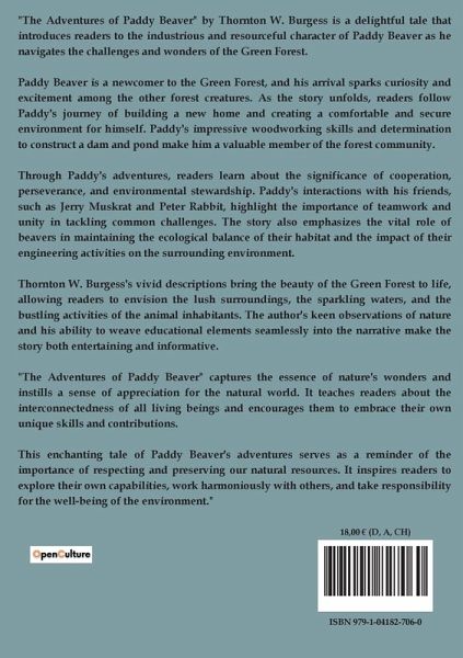"The Adventures of Paddy Beaver" by Thornton W. Burgess is a delightful tale that introduces readers to the industrious and resourceful character of Paddy Beaver as he navigates the challenges and wonders of the Green Forest. Paddy Beaver is a newcomer to the Green Forest, and his arrival sparks curiosity and excitement among the other forest creatures. As the story unfolds, readers follow Paddy's journey of building a new home and creating a comfortable and secure environment for himself. Paddy's impressive woodworking skills and determination to construct a dam and pond make him a valuable member of the forest community. Through Paddy's adventures, readers learn about the significance of cooperation, perseverance, and environmental stewardship. Paddy's interactions with his friends, such as Jerry Muskrat and Peter Rabbit, highlight the importance of teamwork and unity in tackling common challenges. The story also emphasizes the vital role of beavers in maintaining the ecological balance of their habitat and the impact of their engineering activities on the surrounding environment. Thornton W. Burgess's vivid descriptions bring the beauty of the Green Forest to life, allowing readers to envision the lush surroundings, the sparkling waters, and the bustling activities of the animal inhabitants. The author's keen observations of nature and his ability to weave educational elements seamlessly into the narrative make the story both entertaining and informative. "The Adventures of Paddy Beaver" captures the essence of nature's wonders and instills a sense of appreciation for the natural world. It teaches readers about the interconnectedness of all living beings and encourages them to embrace their own unique skills and contributions. This enchanting tale of Paddy Beaver's adventures serves as a reminder of the importance of respecting and preserving our natural resources. It inspires readers to explore their own capabilities, work harmoniously with others, and take responsibility for the well-being of the environment."