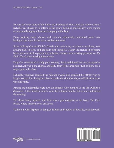 No one had ever heard of the Duke and Duchess of Manx until the whole town of Katville was shaken to its rafters by the news: the Duke and Duchess were coming to town and bringing a theatrical company with them! Every aspiring singer, dancer, and even the pathetically untalented actors were hoping to get a part in the show and become stars! Some of Patty-Cat and Kittle's friends who were away at school or working, were arriving back in town, and had parts in the musical. Cousin Fred returned on spring break and was hired to play in the orchestra. Chester, now working part-time on The Daily Howl, was covering these events. Patty-Cat volunteered to help paint scenery, Susie auditioned and was accepted as a dancer, Al was in the chorus, and Billy-Bom-Tom came home full of glory and a major part in the show. Naturally, whatever attracted the rich and swank also attracted the riffraff who no longer worked for a living but chose to make do with what they could lift from those who had more. Among the undesirables were two cat burglars who planned to lift the Duchess's diamonds. Little Minikin tried to warn her adopted family, but no one understood the warning. The show finally opened, and there was a gala reception at the hotel, The Cat's Pause, where mayhem soon broke out. To find out what happens to the good friends and buddies of Katville, read the book!