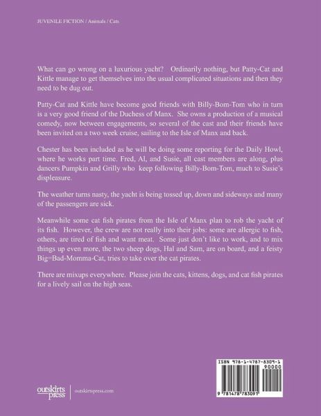 What can go wrong on a luxurious yacht? Ordinarily nothing, but Patty-Cat and Kittle manage to get themselves into the usual complicated situations and then they need to be dug out. Patty-Cat and Kittle have become good friends with Billy-Bom-Tom who in turn is a very good friend of the Duchess of Manx. She owns a production of a musical comedy, now between engagements, so several of the cast and their friends have been invited on a two week cruise, sailing to the Isle of Manx and back. Chester has been included as he will be doing some reporting for the Daily Howl, where he works part time. Fred, Al, and Susie, all cast members are along, plus dancers Pumpkin and Grilly who keep following Billy-Bom-Tom, much to Susie's displeasure. The weather turns nasty, the yacht is being tossed up, down and sideways and many of the passengers are sick. Meanwhile some cat fish pirates from the Isle of Manx plan to rob the yacht of its fish. However, the crew are not really into their jobs: some are allergic to fish, others, are tired of fish and want meat. Some just don't like to work, and to mix things up even more, the two sheep dogs, Hal and Sam, are on board, and a feisty Big=Bad-Momma-Cat, tries to take over the cat pirates. There are mixups everywhere. Please join the cats, kittens, dogs, and cat fish pirates for a lively sail on the high seas.