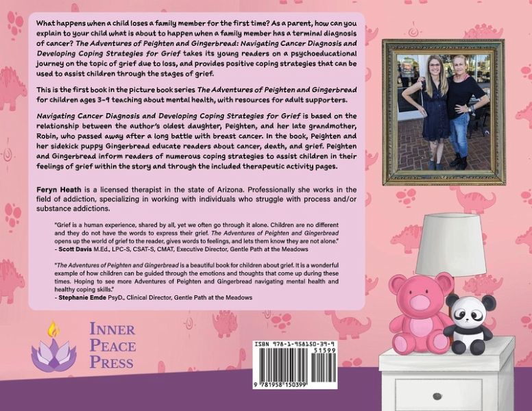 What happens when a child loses a family member for the first time? As a parent, how can you explain to your child what is about to happen when a family member has a terminal diagnosis of cancer? The Adventures of Peighten and Gingerbread: A Story of Grief and Loss takes its young readers on a psychoeducational journey on the topic of grief due to loss, and provides positive coping strategies that can be used to assist children through the five stages of grief. This is the first book in the picture-book series The Adventures of Peighten and Gingerbread for children ages 3-9 teaching about mental health, with resources for adult supporters. A Story of Grief and Loss is based on the relationship between the author's oldest daughter, Peighten, and her late grandmother Robin, who passed away after her long battle with breast cancer. In the book, Peighten and her sidekick puppy Gingerbread educate readers about cancer, death, and grief. Peighten and Gingerbread inform readers of numerous coping strategies to assist children in their feelings of grief within the story and through the included therapeutic activity pages. Feryn Heath is a licensed therapist in the state of Arizona. Professionally, she works in the field of addiction, specializing working with individuals who struggle with process and/or substance addictions. --- "Grief is a human experience, shared by all, yet we often go through it alone. Children are no different and they do not have the words to express their grief. 'The Adventures of Peighten and Gingerbread' opens up the world of grief to the reader, gives words to feelings, and lets them know they are not alone." - Scott Davis M.Ed., LPC-S, CSAT-S, CMAT, Executive Director, Gentle Path at the Meadows "The Adventures of Peighten and Gingerbread is a beautiful book for children about grief. It is a wonderful example of how children can be guided through the emotions and thoughts that come up during these times. Hoping to see more Adventures of Peighten and Gingerbread navigating mental health and healthy coping skills." =Stephanie Emde PsyD., Clinical Director, Gentle Path at the Meadows