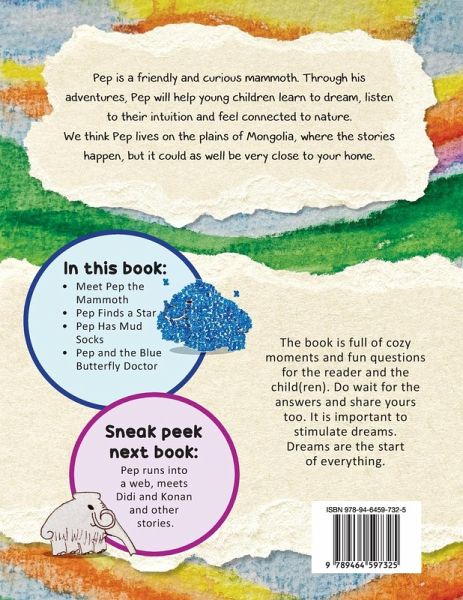 Pep is a friendly and curious mammoth. Through its adventures, Pep will help young children learn to dream, listen to their intuition and feel connected to nature. We think Pep lives on the plains of Mongolia, where most of the stories happen, but it could as well be very close to your home. Each story has a rub of real and a touch of magic. The book is full of cozy moments for the reader and the child(ren), also thanks to some surprising questions of Pep. Do wait for the answers and share yours too. It is important to stimulate dreams. Dreams are the start of everything. In this book: Meet Pep the Mammoth Pep Finds a Star Pep Has Mud Socks Pep and the Blue Butterfly Doctor Sneak peak next book: Pep runs in a web Pep meets Didi and Konan Pep, Opa-moth and the Dreamstone