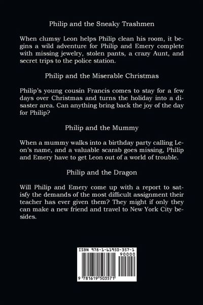 This book contains four of the adventures of Philip Felton and Emery Wyatt. The boys have a rollicking and fun trip through their youth, one mishap at a time. You're gonna love Philip and Emery. John Paulits takes you on one rip-roaring escapade after another. Philip and the Sneaky Trashmen When clumsy Leon helps Philip clean his room, it begins a wild adventure for Philip and Emery complete with missing jewelry, stolen pants, a crazy Aunt, and secret trips to the police station. Philip and the Miserable Christmas Philip's young cousin Francis comes to stay for a few days over Christmas and turns the holiday into a disaster area. Can anything bring back the joy of the day for Philip? Philip and the Mummy When a mummy walks into a birthday party calling Leon's name, and a valuable scarab goes missing, Philip and Emery have to get Leon out of a world of trouble. Philip and the Dragon Will Philip and Emery come up with a report to satisfy the demands of the most difficult assignment their teacher has ever given them? They might if only they can make a new friend and travel to New York City besides.
