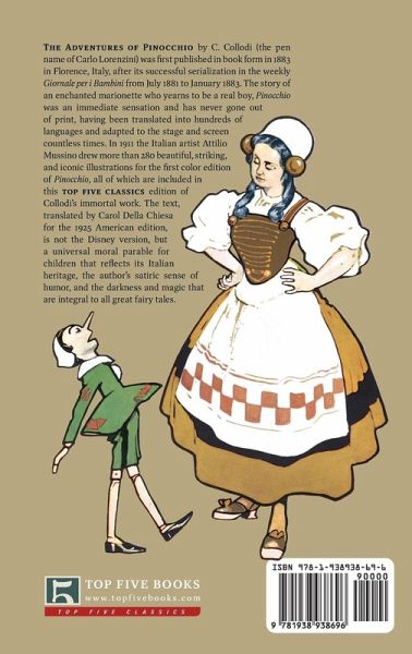 The Adventures of Pinocchio by C. Collodi (the pen name of Carlo Lorenzini) was first published in book form in 1883 in Florence, Italy, after its successful serialization in the weekly Giornale per i Bambini from July 1881 to January 1883. The story of an enchanted marionette who yearns to be a real boy, Pinocchio was an immediate sensation and has never gone out of print, having been translated into hundreds of languages and adapted to the stage and screen countless times. In 1911 the Italian artist Attilio Mussino drew more than 280 beautiful, striking, and iconic illustrations for the first color edition of Pinocchio, which are included in this new Top Five Classics edition of Collodi's immortal work. The text, translated by Carol Della Chiesa for the 1925 American edition, is not the Disney version, but a universal moral parable for children that reflects its Italian heritage and satiric sense of humor, as well as the darkness and magic that are an integral part of all classic fairy tales.