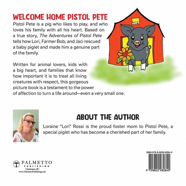 Join Pistol Pete the pig and his family as they learn the meaning of unconditional love and compassion in an incredible true story of life on the farm. Pistol Pete is a special pig-and he knows it, thanks to the love, hard work, and dedication of his human family! At a local pig farm, Farmer Bob and Farmer Kenny discover Pete, a small piglet whose life is in danger. Smaller and more sickly than the others, they work quickly to save the little creature's life. Farmer Kenny, Farmer Bob, Bob's wife Lori, and Lori's sister Jaci rescue Pete together, beginning the amazing journey of helping him grow into a strong and healthy pig. Lori only has a little experience raising pigs-and none taking one in as a part of the family-so she and her family have their hands full. But with a lot of love and plenty of support, Pete's life is in good hands. Today, Pete lives at the barn where he was born, enjoying his own house and fenced-in yard, thanks to Farmer Kenny's craftsmanship. With lots of visitors to spend time with, and plenty of cherry slices to pig out on, Pete is living the high life, all thanks to the efforts of the good people around him. Inspired by her life's events, Lori decided to share Pete's story with everyone. Now young readers can see the heartwarming true story of a pig who is dearly loved. The Adventures of Pistol Pete is the full tale of Pete's journey, illustrated in gorgeous color. Sure to inspire joy in the lives of kids, this book is a family adventure for the ages. A lighthearted, endearing story that's easy to read along with, The Adventures of Pistol Pete is the perfect gift for animal-loving families everywhere.