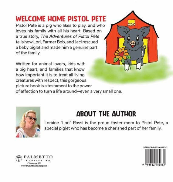 Join Pistol Pete the pig and his family as they learn the meaning of unconditional love and compassion in an incredible true story of life on the farm. Pistol Pete is a special pig-and he knows it, thanks to the love, hard work, and dedication of his human family! At a local pig farm, Farmer Bob and Farmer Kenny discover Pete, a small piglet whose life is in danger. Smaller and more sickly than the others, they work quickly to save the little creature's life. Farmer Kenny, Farmer Bob, Bob's wife Lori, and Lori's sister Jaci rescue Pete together, beginning the amazing journey of helping him grow into a strong and healthy pig. Lori only has a little experience raising pigs-and none taking one in as a part of the family-so she and her family have their hands full. But with a lot of love and plenty of support, Pete's life is in good hands. Today, Pete lives at the barn where he was born, enjoying his own house and fenced-in yard, thanks to Farmer Kenny's craftsmanship. With lots of visitors to spend time with, and plenty of cherry slices to pig out on, Pete is living the high life, all thanks to the efforts of the good people around him. Inspired by her life's events, Lori decided to share Pete's story with everyone. Now young readers can see the heartwarming true story of a pig who is dearly loved. The Adventures of Pistol Pete is the full tale of Pete's journey, illustrated in gorgeous color. Sure to inspire joy in the lives of kids, this book is a family adventure for the ages. A lighthearted, endearing story that's easy to read along with, The Adventures of Pistol Pete is the perfect gift for animal-loving families everywhere.