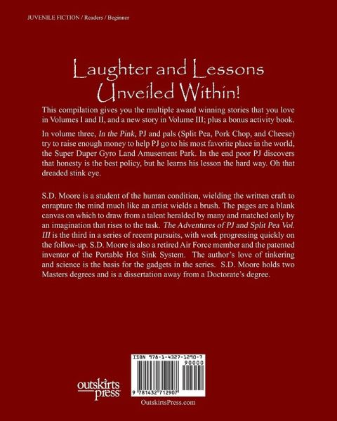 The award winning Adventures of PJ and Split Pea returns in a four volume fun filled set. Now readers can enjoy the hilarious antics of little PJ and his wise cracking British Parrot Split Pea in one collection for a low price. Join PJ and Split Pea on their funny adventures in: Fine Feathered Friends Vol I PJ meets a new friend named Split Pea. Through a series of comedic antics PJ tries to give Split Pea a makeover, but holy hummingbirds humor ensues instead. In the end PJ and Split Pea learn to love and accept each other just the way they are. Nothing but the Tooth Vol II PJ has had a few embarrassing school pictures in his young career. After an incident with a green Magic Marker, PJ ends up looking startlingly similar to a Martian in one photo. In another, he's a gluey-haired mess. But this year, PJ is determined to get a decent photograph-until, that is, he wakes up missing a tooth only one day before class pictures. PJ and his pal Split Pea embark on a series of misadventures in their quest to buy, beg, and even "borrow" a new set of teeth for Picture Day. What could possibly go wrong? In the Pink Vol III PJ is excited about paying for a school trip to his favorite amusement park in the whole world, Super Duper Gyro Land. Unfortunately, when PJ arrives at school he finds a huge hole in his pocket and his trip money is missing. PJ, Split Pea and their pals Pork Chop and Cheese decide to put on a carnival to raise money for PJ, but hilarity ensues instead. In the end PJ and Split Pea learn lessons about trust, honesty, and the dreaded pinky eye. The Adventures of PJ and Split Pea Coloring and Activity Book As an added bonus, readers can now enjoy The Adventures of PJ and Split Pea in a coloring and activity book. About the Author Award winning Author: S.D. Moore is an Air Force veteran who has served as the director of a youth center, host of a self-improvement radio show, patented inventor of The Portable Hot Sink System, and more. She has