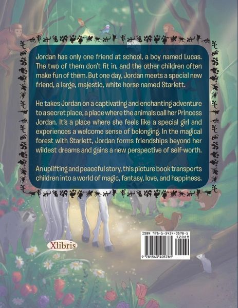 Jordan has only one friend at school, a boy named Lucas. The two of them dont fit in, and the other children often make fun of them. But one day, Jordan meets a special new friend, a large white horse named Starlett. He takes Jordan on a captivating and enchanting adventure to a secret place, a place where the animals call her Princess Jordan. Its a place where she feels like a special girl and experiences a welcome sense of belonging. In the magical forest with Starlett, Jordan forms friendships beyond her wildest dreams and gains a new perspective of self-worth. An uplifting and peaceful story, this picture book transports children into a world of magic, fantasy, love, and happiness.