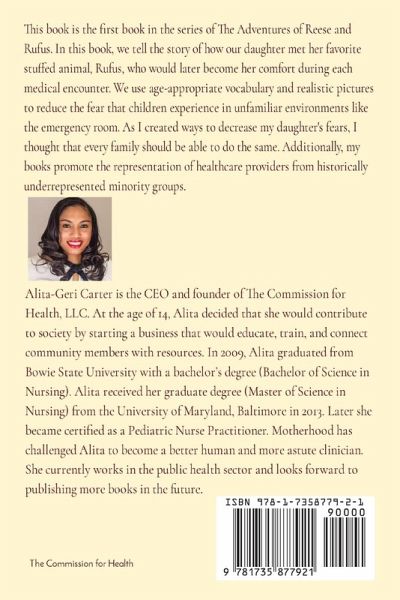 This book is the first book in the series of The Adventures of Reese and Rufus. In this book, we tell the story of how our daughter met her favorite stuffed animal, Rufus, who would later become her comfort during each medical encounter. We use age-appropriate vocabulary and realistic pictures to reduce the fear that children experience in unfamiliar environments like the emergency room. As I created ways to decrease my daughter's fears, I thought that every family should be able to do the same. Additionally, my books promote the representation of healthcare providers from historically underrepresented minority groups.