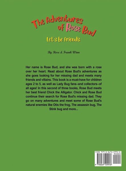 Her name is Rose Bud, and she was born with a rose over her heart. Read about Rose Bud's adventures as she goes looking for her missing dad and meets many friends and villains. This book is a must-have for children ages 2 to 5, as well as Lady Bug fans-and collectors-of all ages! In this second of three books, Rose Bud meets her best friend Chick the Alligator. Chick and Rose Bud continue their search for Rose Bud's missing dad. They go on many adventures and meet some of Rose Bud's natural enemies like Otis the frog, The assassin bug, The Stink bug and more...
