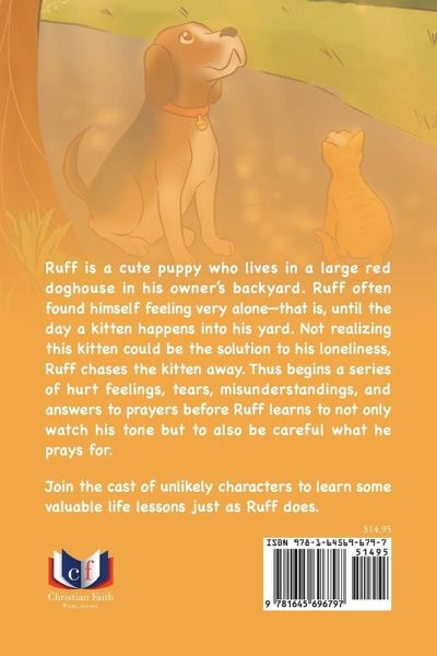 Ruff is a cute puppy who lives in a large red doghouse in his owner's backyard. Ruff often found himself feeling very alone-that is, until the day a kitten happens into his yard. Not realizing this kitten could be the solution to his loneliness, Ruff chases the kitten away. Thus begins a series of hurt feelings, tears, misunderstandings, and answers to prayers before Ruff learns to not only watch his tone but to also be careful what he prays for. Join the cast of unlikely characters to learn some valuable life lessons just as Ruff does.