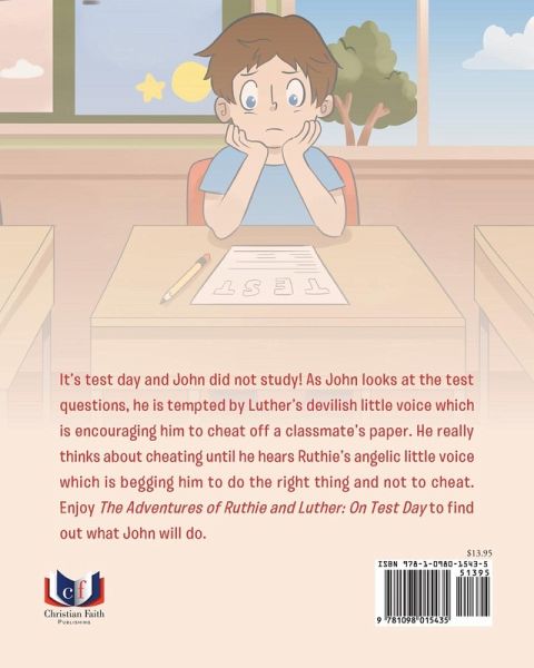 It's test day and John did not study! As John looks at the test questions, he is tempted by Luther's devilish little voice which is encouraging him to cheat off a classmate's paper. He really thinks about cheating until he hears Ruthie's angelic little voice which is begging him to do the right thing and not to cheat. Enjoy The Adventures of Ruthie and Luther: On Test Day to find out what John will do.