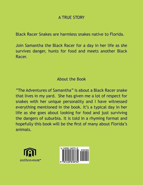 "The Adventures of Samantha" is about a Black Racer snake that lives in my yard. She has given me a lot of respect for snakes with her unique personality and I have witnessed everything mentioned in the book. It's a typical day in her life as she goes about looking for food and just surviving the dangers of suburbia. It is told in a rhyming format and hopefully this book will be the first of many about Florida's animals.