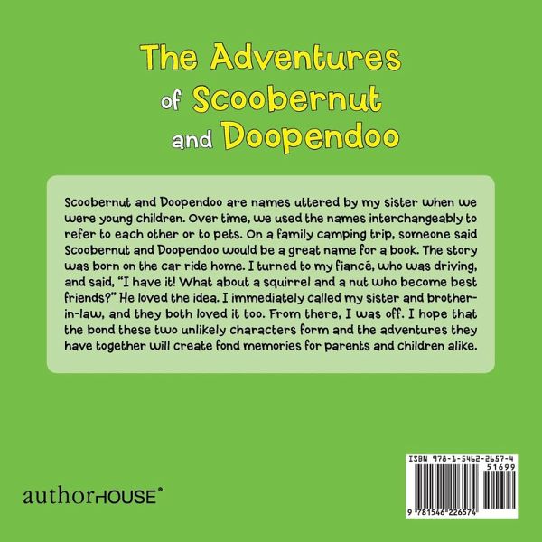 Scoobernut and Doopendoo are names uttered by my sister when we were young children. Over time, we used the names interchangeably to refer to each other or to pets. On a family camping trip, someone said Scoobernut and Doopendoo would be a great name for a book. The story was born on the car ride home. I turned to my fianc, who was driving, and said, I have it! What about a squirrel and a nut who become best friends? He loved the idea. I immediately called my sister and brother-in-law, and they both loved it too. From there, I was off. I hope that the bond these two unlikely characters form and the adventures they have together will create fond memories for parents and children alike.