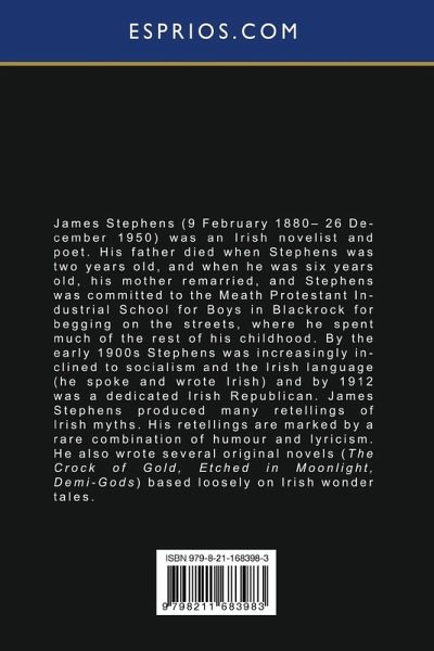 James Stephens (9 February 1880- 26 December 1950) was an Irish novelist and poet. His father died when Stephens was two years old, and when he was six years old, his mother remarried, and Stephens was committed to the Meath Protestant Industrial School for Boys in Blackrock for begging on the streets, where he spent much of the rest of his childhood. By the early 1900s Stephens was increasingly inclined to socialism and the Irish language (he spoke and wrote Irish) and by 1912 was a dedicated Irish Republican. James Stephens produced many retellings of Irish myths. His retellings are marked by a rare combination of humour and lyricism. He also wrote several original novels (The Crock of Gold, Etched in Moonlight, Demi-Gods) based loosely on Irish wonder tales.