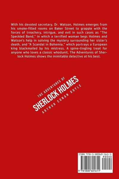 Do you want to read The Adventures of Sherlock Holmes? If so then keep reading... With his devoted secretary, Dr. Watson, Holmes emerges from his smoke-filled rooms on Baker Street to grapple with the forces of treachery, intrigue, and evil in such cases as "The Speckled Band," in which a terrified woman begs Holmes and Watson's help in solving the mystery surrounding her sister's death, and "A Scandal in Bohemia," which portrays a European king blackmailed by his mistress. A spine-tingling treat for anyone who loves a classic whodunit, The Adventures of Sherlock Holmes shows the inimitable detective at his best. What are you waiting for The Adventures of Sherlock Holmes is one click away, select the "Buy Now" button in the top right corner NOW!