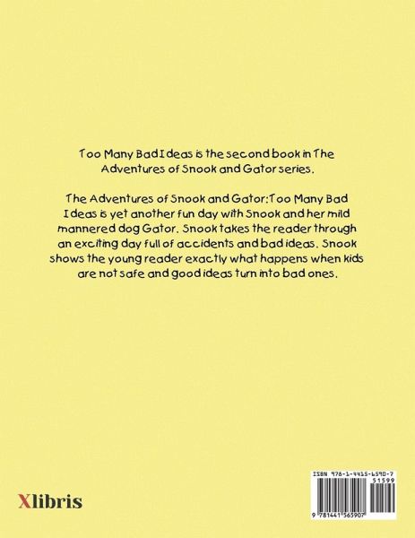 Too Many Bad Ideas is the second book in The Adventures of Snook and Gator series. The Adventures of Snook and Gator: Too Many Bad Ideas is yet another fun day with Snook and her mild mannered dog Gator. Snook takes the reader through an exciting day full of accidents and bad ideas. Snook shows the young reader exactly what happens when kids are not safe and good ideas turn into bad ones.