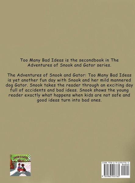 Too Many Bad Ideas is the second book in The Adventures of Snook and Gator series. The Adventures of Snook and Gator: Too Many Bad Ideas is yet another fun day with Snook and her mild mannered dog Gator. Snook takes the reader through an exciting day full of accidents and bad ideas. Snook shows the young reader exactly what happens when kids are not safe and good ideas turn into bad ones.