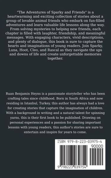 "The Adventures of Sparky and Friends" is a heartwarming and exciting collection of stories about a group of lovable animal friends who embark on fun-filled adventures and learn valuable life lessons along the way. From solving mysteries to helping new friends, each chapter is filled with laughter, friendship, and meaningful messages. With engaging characters, vivid descriptions, and plenty of dialogue, this book is sure to capture the hearts and imaginations of young readers. Join Sparky, Luna, Hoot, Cleo, and Rascal as they navigate the ups and downs of life and create unforgettable memories together.