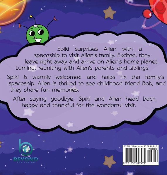 Spiki surprises Alien with a spaceship to visit Alien's family. Excited, they leave right away and arrive on Alien's home planet, Lumina, reuniting with Alien's parents and siblings. Spiki is warmly welcomed and helps fix the family's spaceship. Alien is thrilled to see childhood friend Bob, and they share fun memories. After saying goodbye, Spiki and Alien head back, happy and thankful for the wonderful visit.