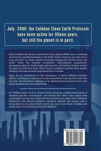 July, 2090: the Callahan Clean Earth Protocols have been active for fifteen years, but still the planet is in peril. Stone Callahan has dreams of poisoned rivers, dying wildlife, and a crumbling environment pushing humanity to the brink. Finite resources can only last so long, and there are large numbers of people bringing the horizon closer and closer. Stone has enemies everywhere. International corporations, government agencies both foreign and domestic, and military leaders around the globe all want him dead. They'll stop at nothing to protect their profits, building vast bank accounts atop mountains of corpses. Enjoy all six installments in the Adventures of Stone Callahan omnibus edition, a thrilling eco-adventure of epic proportions! Lace up your boots, don your hat, and join Stone Callahan on his global journey to preserve the only planet humanity has ever called home. R.F. Walden writes cli-fi, or climate fiction, about the complex interactions of mankind and the environment-interactions that often come paired with catastrophic consequences when the wrong choices are made. Fans of Barbara Kingsolver, Kim Stanley Robinson, Margaret Atwood, and anyone with a strong desire to see planet Earth survive are sure to love Stone Callahan and all the other cli-fi adventures from R.F. Walden!