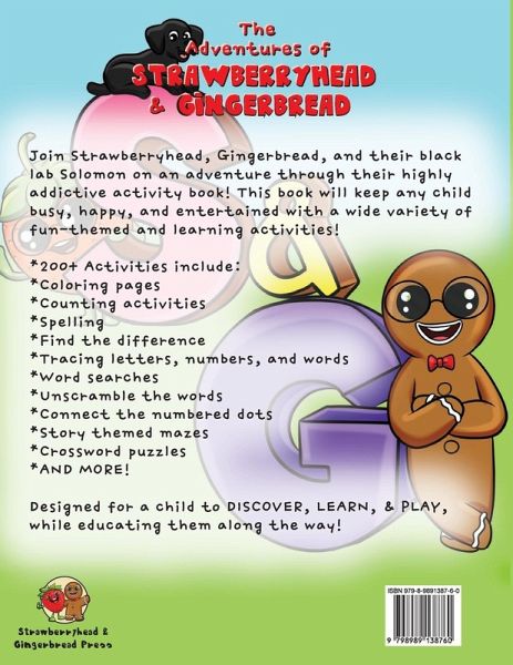 Perfect gift idea for kids ages Preschool-2nd grade! All abilities! Packed full of colorful illustrations: counting, tracing, unscrambling, spelling, and many more! Join Strawberryhead, Gingerbread, and their black lab Solomon on an adventure through their highly addictive educational activity book! This book will keep any child busy, happy, and entertained with a wide variety of fun-themed and learning activities for all abilities! 200+ Activities include: *Coloring pages *Counting activities *Spelling *Find the difference *Tracing letters, numbers, and words *Word searches *Unscramble the words *Connect the numbered dots *Story themed mazes *Crossword puzzles *AND MORE! Designed for a child to DISCOVER, LEARN, & PLAY, while educating them along the way!