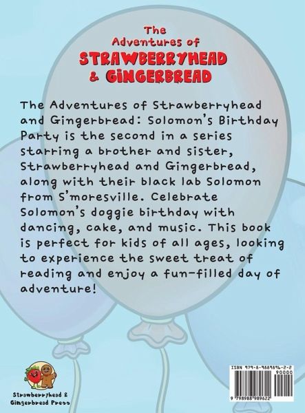 The Adventures of Strawberryhead and Gingerbread: Solomon's Birthday Party is the second in a series starring a brother and sister, Strawberryhead and Gingerbread, along with their black lab Solomon from S'moresville. Celebrate Solomon's doggie birthday with dancing, cake, and music. This book is perfect for kids of all ages, looking to experience the sweet treat of reading and enjoy a fun-filled day of adventure!