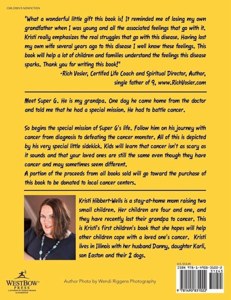 "What a wonderful little gift this book is! It reminded me of losing my own grandfather when I was young and all the associated feelings that go with it. Kristi really emphasizes the real struggles that go with this disease. Having lost my own wife several years ago to this disease I well know these feelings. This book will help a lot of children and families understand the feelings this disease sparks. Thank you for writing this book!" -Rich Vosler, Certifed Life Coach and Spiritual Director, Author, single father of 9, www.RichVosler.com Meet Super G. He is my grandpa. One day he came home from the doctor and told me that he had a special mission. He had to battle cancer. So begins the special mission of Super G's life. Follow him on his journey with cancer from diagnosis to defeating the cancer monster. All of this is depicted by his very special little sidekick. Kids will learn that cancer isn't as scary as it sounds and that your loved ones are still the same even though they have cancer and may sometimes seem different. A portion of the proceeds from all books sold will go toward the purchase of this book to be donated to local cancer centers.