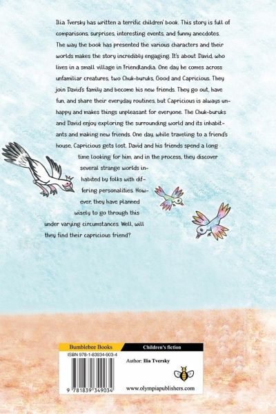 Ilia Tversky has written a terrific children' book. This story is full of comparisons, surprises, interesting events, and funny anecdotes. The way the book has presented the various characters and their worlds makes the story incredibly engaging. It's about David, who lives in a small village in Friendlandia. One day he comes across unfamiliar creatures, two Chuk-buruks, Good and Capricious. They join David's family and become his new friends. They go out, have fun, and share their everyday routines, but Capricious is always unhappy and makes things unpleasant for everyone. The Chuk-buruks and David enjoy exploring the surrounding world and its inhabitants and making new friends. One day, while traveling to a friend's house, Capricious gets lost. David and his friends spend a long time looking for him, and in the process, they discover several strange worlds inhabited by folks with differing personalities. However, they have planned wisely to go through this under varying circumstances. Well, will they find their capricious friend?