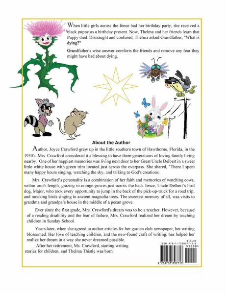 Author, Joyce Crawford grew up in the little southern town of Hawthorne, Florida, in the 1950's. Mrs. Crawford considered it a blessing to have three generations of loving family living nearby. One of her happiest memories was living next door to her Great Uncle Delbert in a sweet little white house with green trim located just across the overpass. She shared, "There I spent many happy hours singing, watching the sky, and talking to God's creations. Mrs. Crawford's personality is a combination of her faith and memories of watching cows, within arm's length, grazing in orange groves just across the back fence; Uncle Delbert's bird dog, Major, who took every opportunity to jump in the back of the pick-up-truck for a road trip; and mocking birds singing in ancient magnolia trees. The sweetest memory of all, was visits to grandma and grandpa's house in the middle of a pecan grove. Ever since the first grade, Mrs. Crawford's dream was to be a teacher. However, because of a reading disability and the fear of failure, Mrs. Crawford realized her dream by teaching children in Sunday School. Years later, when she agreed to author articles for her garden club newspaper, her writing blossomed. Her love of teaching children, and the new-found craft of writing, has helped her realize her dream in a way she never dreamed possible. After her retirement, Ms. Crawford, starting writing stories for children, and Thelma Thistle was born.