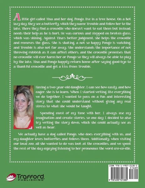 A little girl called Tina and her dog, Pongo, live in a tree house. On a hot lazy day, they see a butterfly, which they name Trouble and follow her to the lake. There they find a crocodile who doesn't want to eat them but instead, needs their help as he is hurt. He was curious and stepped on broken glass, which was shining. Against Tina's better judgment, she helps the crocodile and removes the glass. She is shaking, a not so happy Pongo is watching, and Trouble is also not far away. She understands the importance of not throwing rubbish as it can affect others, and the crocodile promises that…mehr