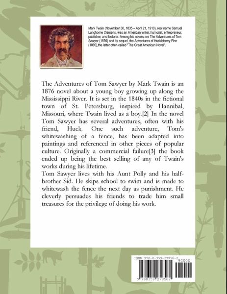 The Adventures of Tom Sawyer by Mark Twain is an 1876 novel about a young boy growing up along the Mississippi River. It is set in the 1840s in the fictional town of St. Petersburg, inspired by Hannibal, Missouri, where Twain lived as a boy. In the novel Tom Sawyer has several adventures, often with his friend, Huck. One such adventure, Tom's whitewashing of a fence, has been adapted into paintings and referenced in other pieces of popular culture. Originally a commercial failure the book ended up being the best selling of any of Twain's works during his lifetime