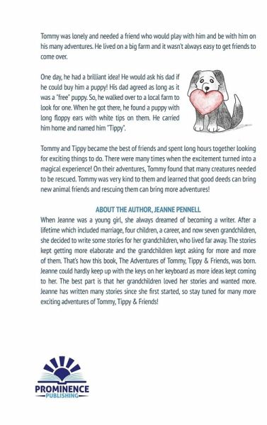 Tommy was lonely and needed a friend who would play with him and be with him on his many adventures. He lived on a big farm and it wasn't always easy to get friends to come over. One day, he had a brilliant idea! He would ask his dad if he could buy him a puppy! His dad agreed as long as it was a "free" puppy. So, he walked over to a local farm to look for one. When he got there, he found a puppy with long floppy ears with white tips on them. He carried him home and named him "Tippy". Tommy and Tippy became the best of friends and spent long hours together looking for exciting things to do. There were many times when the excitement turned into a magical experience! On their adventures, Tommy found that many creatures needed to be rescued. Tommy was very kind to them and learned that good deeds can bring new animal friends and rescuing them can bring more adventures!
