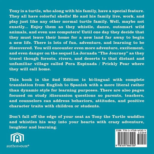 Tony is a turtle, who along with his family, have a special feature. They all have colorful shells! He and his family live, work, and play just like any other normal turtle family. Well, maybe not exactly... Enjoy them as they whistle, dance, outsmart wild animals, and even use computers! Until one day they decide that they must leave their home for a new land far away to begin a new life. There is lots of fun, adventure, and learning to be discovered. You will encounter even more adventure, excitement, and even danger on the sequel La Jornada "The Journey" as they travel though forests, rivers, and deserts to that distant and unfamiliar village called Pera Espinada / Prickly Pear where they will call home. This book is the 2nd Edition is bi-lingual with complete translation from English to Spanish with a more literal rather than dynamic style for learning purposes. There are also pages focused on study /discussion questions so parents, teachers, and counselors can address behaviors, attitudes, and positive character traits with children or students. Don't fall off the edge of your seat as Tony the Turtle waddles and whistles his way into your hearts with crazy adventure, laughter and learning.