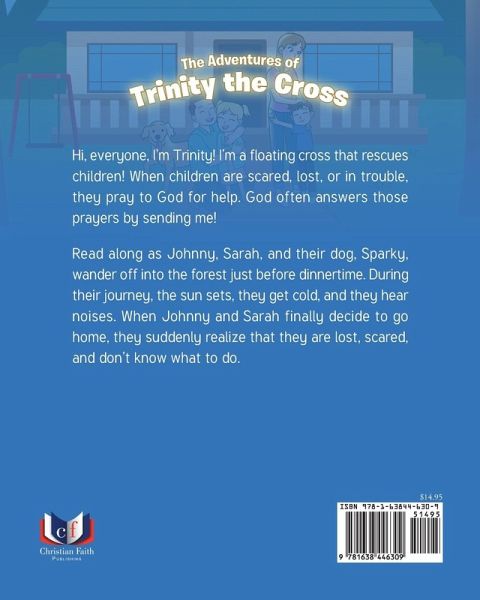 Hi, everyone, I'm Trinity! I'm a floating cross that rescues children! When children are scared, lost, or in trouble, they pray to God for help. God often answers those prayers by sending me! Read along as Johnny, Sarah, and their dog, Sparky, wander off into the forest just before dinnertime. During their journey, the sun sets, they get cold, and they hear noises. When Johnny and Sarah finally decide to go home, they suddenly realize that they are lost, scared, and don't know what to do.