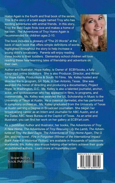 Home Again is the fourth and final book of the series. This is the story of a bald eagle named Troy who has exciting adventures with animal friends. In this story, Troy the Bald Eagle finds love and makes a home of his own. The Adventures of Troy Home Again is recommended for children ages 2-10. The book includes a glossary of "The 20 Words" at the back of each book that offers simple definitions of words highlighted throughout the story to help increase a young child's vocabulary. Parents will enjoy reading these books to their toddlers. Elementary school children will love reading these heartwarming tales of friendship and adventure on their own. Author and Illustrator, Hope Kelley, is Owner of ECBYbooks, a fully integrated online bookstore. She is also Producer, Director, and Writer for Hope Kelley Productions & South 16 Films. Ms.Kelley hosted and directed the tv program, SA Style, in San Antonio, Texas. She was awarded the honor of directing and producing a documentary, Project Hope, in Washington, D.C. Ms. Kelley is also a talented journalist, anchor, actor, and spokeswoman who has appeared in films, tv programs, and commercials. Ms. Kelley was awarded the UIL Scholarship in Music to the University of Texas at Austin. As a classical clarinetist, she has performed in symphony orchestras. Ms. Kelley graduated from the University of Texas at Austin earning a Degree in Broadcast Journalism. She began her broadcasting career as an Intern and Journalist for ABC Austin, and at the Dallas ABC News Bureau at the Capitol of Texas. As an artist and illustrator, you can find her work on her gallery at ECBYart.com. As a published Author and Illustrator, her books, The Adventures of Troy A New Home, The Adventures of Troy Rescuing Lily the Lamb, The Adventures of Troy the Bald Eagle, The Adventures of Troy Home Again, The G Sin, and her novel , Fire in Forgotten (Winner of the International Impact Book Award in Historical Fiction), are available in thousands of bookstores worldwide. Ms. Kelley also enjoys helping other writers achieve their goals as published authors. Learn more at HopeKelley.com opeKelley.com