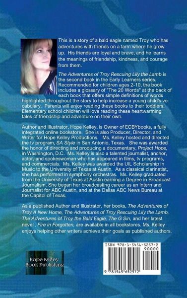 This is a story of a bald eagle named Troy who has adventures with friends on a farm where he grew up. His friends are loyal and brave, and he learns the meaning of friendship, kindness, and courage from them. The Adventures of Troy Rescuing Lily the Lamb is the second book in the Early Learners series. Recommended for children ages 2-9, the book includes a glossary of "The 20 Words" at the back of the book that offers simple definitions of words highlighted throughout the story to help increase a young child's vocabulary. Parents will enjoy reading this book to their toddlers. Elementary school children will love reading this heart-warming tale of friendship and adventure on their own. Author and Illustrator, Hope Kelley, is Owner of ECBYbooks, a fully integrated online bookshop. She is also Producer, Director, and Writer for Hope Kelley Productions. Ms. Kelley hosted and directed the tv program, SA Style in San Antonio, Texas. She was awarded the honor of directing/producing a documentary, Project Hope, in Washington, D.C. Ms. Kelley is also a talented journalist, anchor, actor, and spokeswoman who has appeared in films, television programs, and commercials. Ms. Kelley was awarded the UIL Scholarship in Music to the University of Texas at Austin. As a classical clarinetist, she has performed in orchestras. Ms. Kelley graduated from the University of Texas at Austin earning a Degree in Broadcast Journalism. She began her broadcasting career as an Intern/Journalist for ABC Austin, and at the Dallas ABC News Bureau at the Capitol of Texas. As a published Author and Illustrator, her books, The Adventures of Troy A New Home, The Adventures of Troy Rescuing Lily the Lamb, The Adventures of Troy the Bald Eagle, The G Sin, and her latest novel, Fire in Forgotten, are available in all bookstores. Ms. Kelley enjoys helping other writers achieve their goals as published authors.