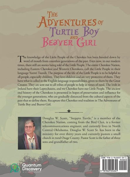 The knowledge of the Little People of the Cherokee has been handed down by word of mouth from countless generations of the past. Even now, in our modern times, there still are stories being told of the Little People. The entire Cherokee Nation, including Eastern Cherokee and Western Cherokees, call the Little People in their language Yunwi Tsundi. The purpose of the life of the Little People is to be helpful to all people, especially children. They love children and are very protective of them. They have what is called in the English language responsibilities, given to them by the Great Creator. They are sent out to all tribes of people to help in times of need. The Irish in Ireland have their Leprechauns, and we Cherokee have our Little People. The ancient oral history of the Cherokees is presented in hopes of preservation and influence for the younger generations, who are gradually distanced from the cultural aspects of the past that so define them. Recapture this Cherokee oral tradition in The Adventures of Turtle Boy and Beaver Girl. Douglas W. Scott, "Steppin Turtle," is a member of the Cherokee Nation, coming from the Bird Clan, is a former telecommunications engineer, and currently lives in North Central Oklahoma. Douglas W. Scott Sr. has been in the ministry for over thirty years and currently pastors a small church in rural Osage County. Pastor Scott is the father of three sons and grandfather of two.