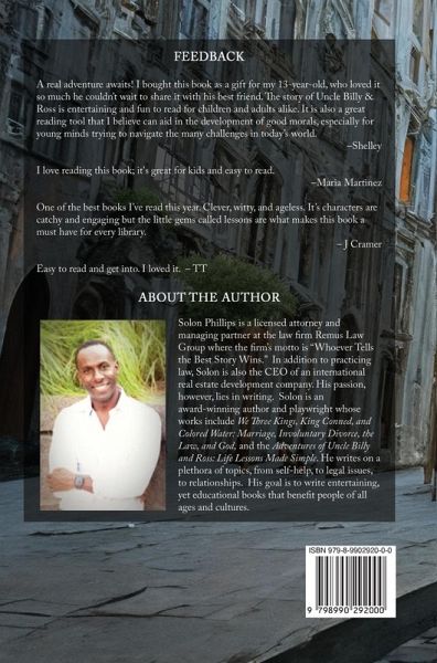 The Adventures of Uncle Bill and Ross: Life Lessons Made Simple is a beautifully written coming-of-age book by Solon Phillips. The story is based on everyday life experiences that can be relatable to both young people and adults. The adventures narrated in the book are not about Ross Miller flying through the air and battling pirates like an urban Peter Pan. Instead, they depict the adventures of real life as experienced by a thirteen-year-old boy who is an only child raised by his mother in a tough city neighborhood. The story revolves around Ross and his retired Uncle Billy coming together each day after school to share their daily life experiences. The bond between the two is enchanting, exemplifying and demonstrating the power of mentorship, defying the odds, and love.