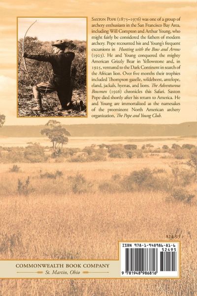 Saxton Pope (1875-1976) was one of a group of archery enthusiasts in the San Francisco Bay Area, including Will Compton and Arthur Young, who might fairly be considered the fathers of modern archery. Pope recounted his and Young's frequent excursions in Hunting with the Bow and Arrow (1923). He and Young conquered the mighty American Grizzly Bear in Yellowstone and, in 1925, ventured to the Dark Continent in search of the African lion. Over five months their trophies included Thompson gazelle, wildebeest, antelope, eland, jackals, hyenas, and lions. The Adventurous Bowmen (originally published in 1926) chronicles this Safari. Saxton Pope died shortly after his return to America. He and Young are immortalized as the namesakes of the preeminent North American archery organization, The Pope and Young Club.