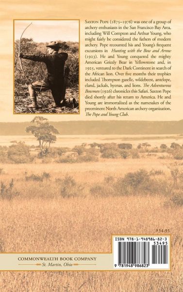 Saxton Pope (1875-1976) was one of a group of archery enthusiasts in the San Francisco Bay Area, including Will Compton and Arthur Young, who might fairly be considered the fathers of modern archery. Pope recounted his and Young's frequent excursions in Hunting with the Bow and Arrow (1923). He and Young conquered the mighty American Grizzly Bear in Yellowstone and, in 1925, ventured to the Dark Continent in search of the African lion. Over five months their trophies included Thompson gazelle, wildebeest, antelope, eland, jackals, hyenas, and lions. The Adventurous Bowmen (originally published in 1926) chronicles this Safari. Saxton Pope died shortly after his return to America. He and Young are immortalized as the namesakes of the preeminent North American archery organization, The Pope and Young Club.