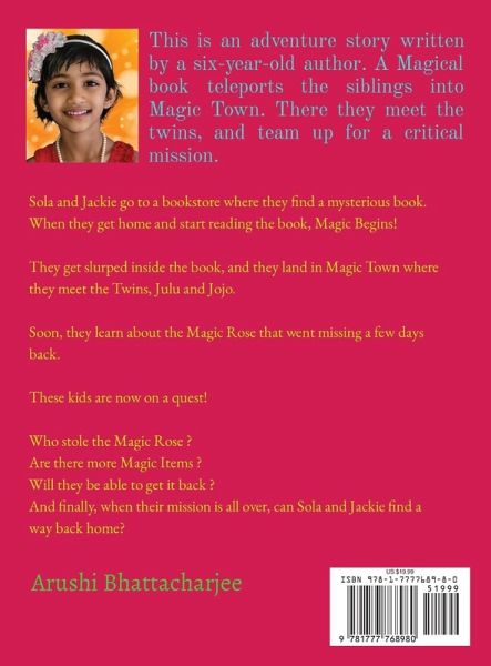 "Readers' Favorite" FIVE STAR Review! This is an adventure story written by a six-year-old author. A Magical book teleports the siblings into Magic Town. There they meet the twins and team up for a critical mission. EXCERPTS from the book "....The cars can be seen flying around and if the drivers go too fast, they shoot up like a rocket. The houses do silly things like teleporting to warmer places in the winter, similar to a migrating bird. Sometimes the houses can be seen dancing and the people inside the house sleepwalking." Sola and Jackie go to a bookstore where they find a mysterious book. When they get home and start reading the book, Magic Begins! They get slurped inside the book, and they land in Magic Town where they meet the twins, Julu and Jojo. Soon, they learn about the Magic Rose that went missing a few days back. These kids are now on a quest! Who stole the Magic Rose ? Are there more Magic Items ? Will they be able to get it back ? And finally, when their mission is all over, can Sola and Jackie find a way back home?