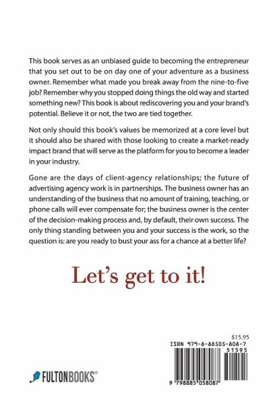 This book serves as an unbiased guide to becoming the entrepreneur that you set out to be on day one of your adventure as a business owner. Remember what made you break away from the nine-to-five job? Remember why you stopped doing things the old way and started something new? This book is about rediscovering you and your brand's potential. Believe it or not, the two are tied together. Not only should this book's values be memorized at a core level but it should also be shared with those looking to create a market-ready impact brand that will serve as the platform for you to become a leader in your industry. Gone are the days of client-agency relationships; the future of advertising agency work is in partnerships. The business owner has an understanding of the business that no amount of training, teaching, or phone calls will ever compensate for; the business owner is the center of the decision-making process and, by default, their own success. The only thing standing between you and your success is the work, so the question is: are you ready to bust your ass for a chance at a better life? Let's get to it!