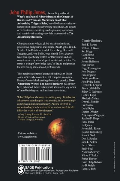 s View Celebrities in Advertising - Abhilasha Mehta Emotion and Advertising - Esther Thorson Hierarchies of Effect - John Philip Jones Advertising Theories Cognitive Dissonance and Selective Perception - Carri Brown, Betzi-Lynn Hanc and Nujchayada Pangsapa Their Relevance to Advertising The Creative Characteristics of Successful Television Advertising - John Philip Jones Comparative Advertising - Jan S Slater The Unique Selling Proposition and Usage-Pull - John Philip Jones Truth and Weasels - David Ogilvy Television Production Costs - Jan S Slater PART THREE: MEDIA ASPECTS Media-Medium-Mediorum - Stephen P Phelps Media Definitions Television Advertising - Erwin Ephron Continuity Scheduling (Advertising without Gaps) What Does Effective Frequency Mean Today? - John Philip Jones Barter Syndication - Brian Philip Webster Cable Television - Jeremiah L Rosen, Laura A York and Aileen (Shih-I) Ku PART FOUR: SALES PROMOTIONS AND SPECIALIST MEDIA Trends in Promotions - John Philip Jones Integrated Marketing Communications and How It Relates to Traditional Media Advertising - Don E Schultz Integrated Marketing Communications in Practice - John Deighton A Roadmap to On-line Marketing Strategy - Rex Briggs Direct Marketing - Sidney C Liebenson Direct-Response Advertising - Emily Soell Creative Principles Promotions and Advertising - John Philip Jones Comparison of Effectiveness Specialty Advertising - William H Bolen Event Marketing - Shirley F Taylor and Peggy H Cunningham Sports Advertising and the Super Bowl - Rick Burton Business-to-Business Advertising - Beth E Barnes Product Packaging - Jan S Slater The Silent Salesman Public Relations and Advertising - Ian R Bruce PART FIVE: LEGISLATION AND ETHICS The Supreme Court of the United States and the First Amendment Protection of Advertising - Jay B Wright Ethics of Advertising - Peggy H Cunningham Oxymoron or Good Business Practice?