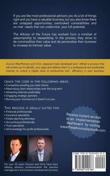 Practice management is often misunderstood. The Advisor Playbook will take the mystery away. Practice management is confused with marketing, or is limited to strategizing about branding, or simply equated to old-school salesmanship. Practice management is how you build an organized toolbox of all your processes - branding, marketing, service activities, core functions - and constantly tune and keep that toolbox efficient and effortless. It's a network of interrelated skills, processes and strategies that build value in a business while making it manageable, scalable and ensuring the owner runs the business and not the other way around. Duncan MacPherson and Pareto Systems have been in the forefront of practice management in the realm of the professional advisor for a quarter-century. Chris Jeppesen of First Trust brings his own decades of professional knowledge to the table. The processes in The Advisor Playbook have grown over those years, through constant refinement and improvement. They'll help you to perform that same refinement and improvement on your business, and regain liberation and order in your personal and professional life. As you progress through the book, you'll realize that each process is implemented in synergy with every other. Referrals are influenced by your service which is influenced by your process, which is influenced by your philosophy, which is influenced by your ideal client definition, life and business goals. Nothing exists in a vacuum, and everything is, in the end, focused on a single unwavering goal: To build real, advocate relationships with your ideal clients that will generate both growth through referrals and the capacity for that growth. How you are perceived is key in every step of that circle, and readers who take on board what the Playbook outlines will come away with an understanding of how they are perceived, how to cast themselves as a consultant with a process rather than a salesperson with a quota, and will set a constantly rising bar for their own success. You'll be amazed at how common-sense most of the processes and strategies seem, and probably horrified at how often you've wandered from the path or failed to implement them due to a lack of clarity or simple distraction. The Playbook will guide you to an actionable plan and process that makes going to work a positive experience, and a positive investment.